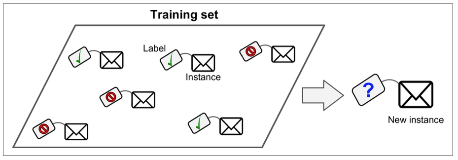 Pada supervised learning, data latih (training set) yang digunakan untuk pembelajaran algoritma harus memiliki solusi atau nilai benarnya dan sering disebut sebagai "label". Sebagai contoh sistem filter email. Algoritma dapat membedakan antara email "spam" dan "ham" dikarenakan pada proses pelatihan, algoritma telah diberi contoh seperti apa karakteristik email "spam" dan "ham" dengan memberikan label pada data email.