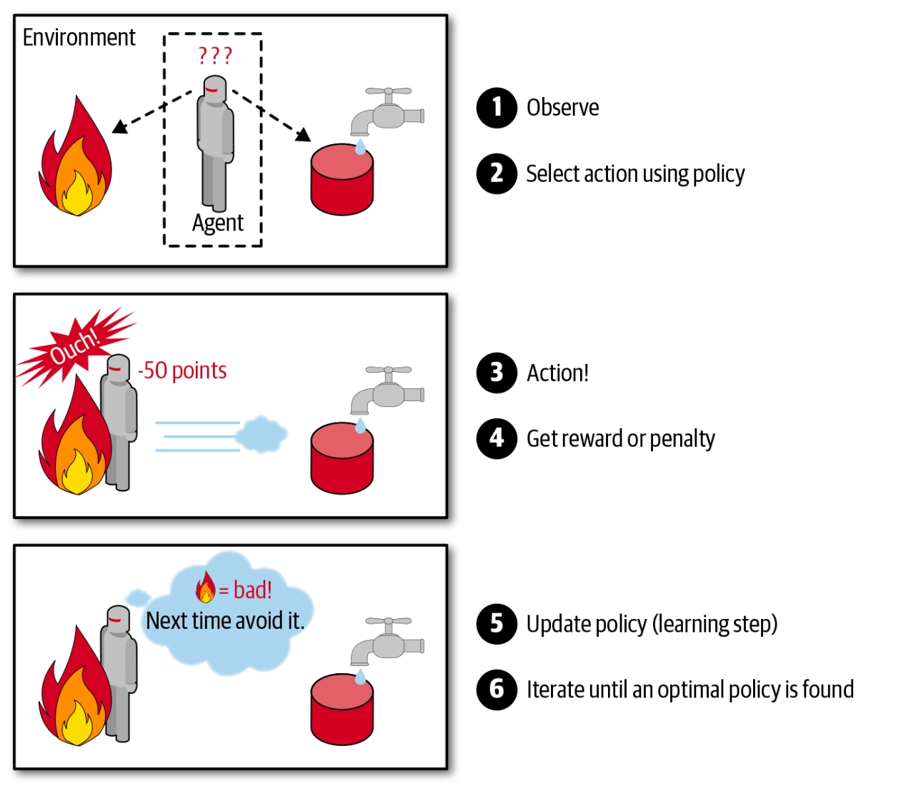Tipe pembelajaran ini berbeda dengan tipe yang sudah dibahas sebelumnya. Reinforcement learning tidak menggunakan data latih untuk proses pembelajaran, akan tetapi langsung melakukan proses pelatihan pada kondisi sebenarnya. Terdapat 3 konsep utama yang perlu dipahami dalam reinforcement learning, yaitu