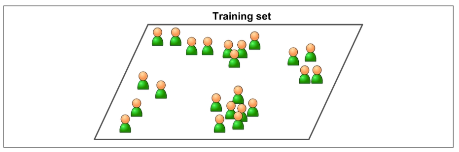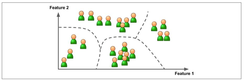 Sebagai ilustrasi, Gambar 5 menunjukkan training set yang akan digunakan dalam proses pembelajaran. Training set merupakan data pengujung supermarket. Kita ingin mengelompokkan pengujung-pengunjung tersebut sesuai dengan kesamaan karakteristik. Algoritma unsupervised learning akan membuat boundary (batas) antara kelompok satu dengan kelompok lain sehingga kita dapat memisahkan data berdasarkan karakteristiknya. Gambar 6 merupakan ilustrasi pengelompokan yang dilakukan oleh algoritma unsupervised learning.