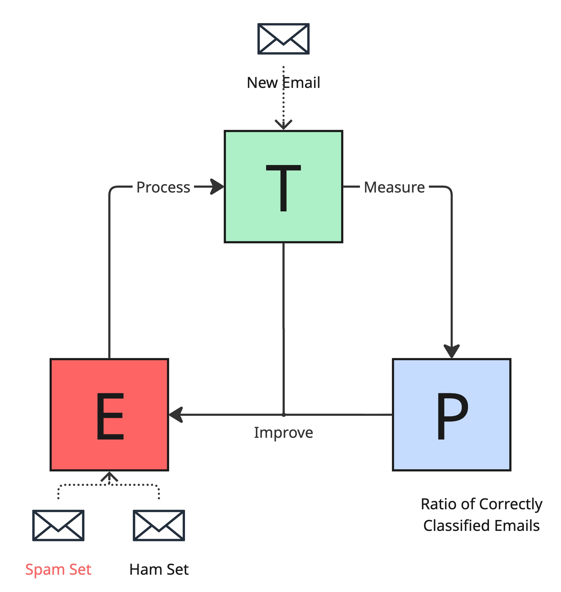 Experience (E) β Contoh-contoh data email "spam" dan "ham" untuk dipelajari.