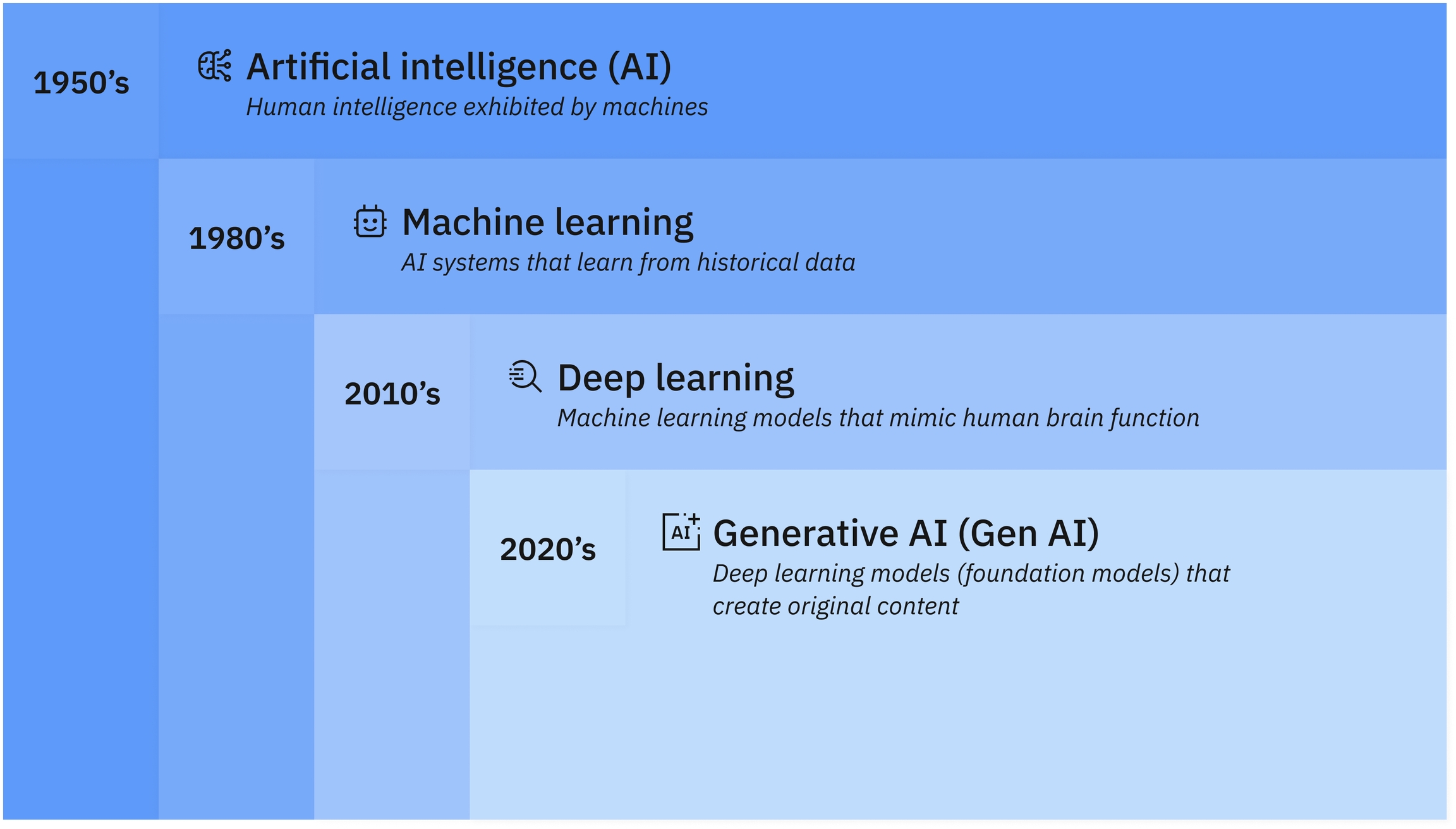 Garis waktu dan ilustrasi irisan konsep AI, ML, DL, dan GenAI digambarkan dengan oleh IBM yang dapat dilihat pada Gambar 1.