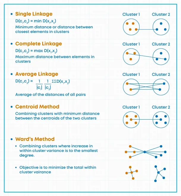 Sama seperti metode klasterisasi pada umumnya, pengelompokan data pada hierarchical clustering juga menggunakan konsep jarak. Pada hierarchical clustering terdapat beberapa konsep jarak untuk menentukan jarak antar cluster, yaitu,